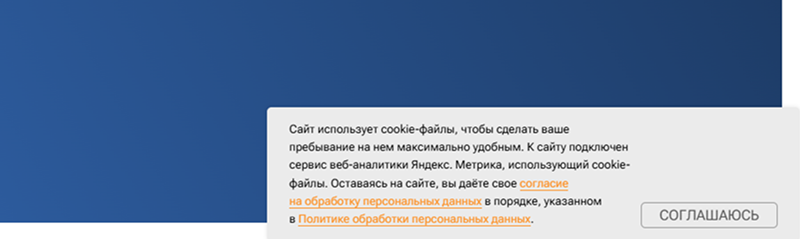• Для обычного сайта без аналитики: Сайт использует cookie-файлы, чтобы сделать ваше пребывание на нем максимально удобным. Оставаясь на сайте, вы даёте согласие на их использование. И важный момент, фраза «согласие на использование cookie-файлов» должна быть ссылкой на страницу согласия на обработку персональных данных пользователя сайта.